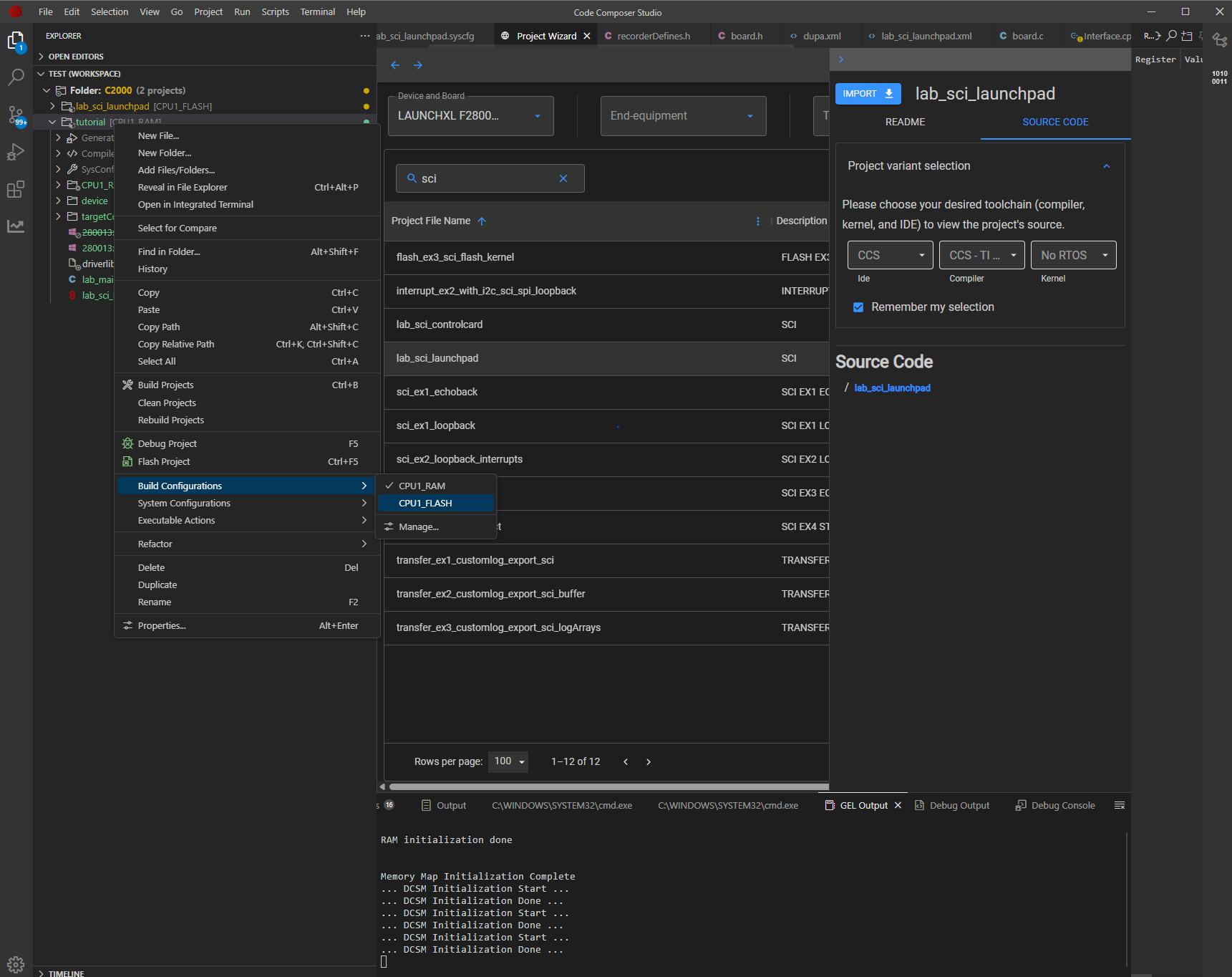 First we have to create a new project based on the launchpad board that we’ll be using. We can select “lab_sci_launchpad” as the starting example.