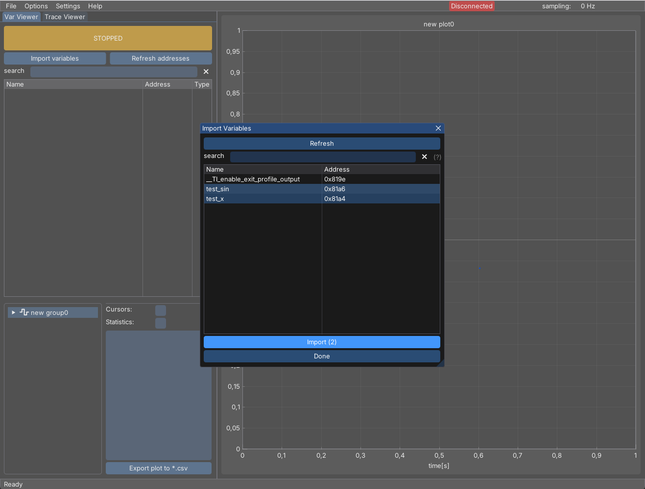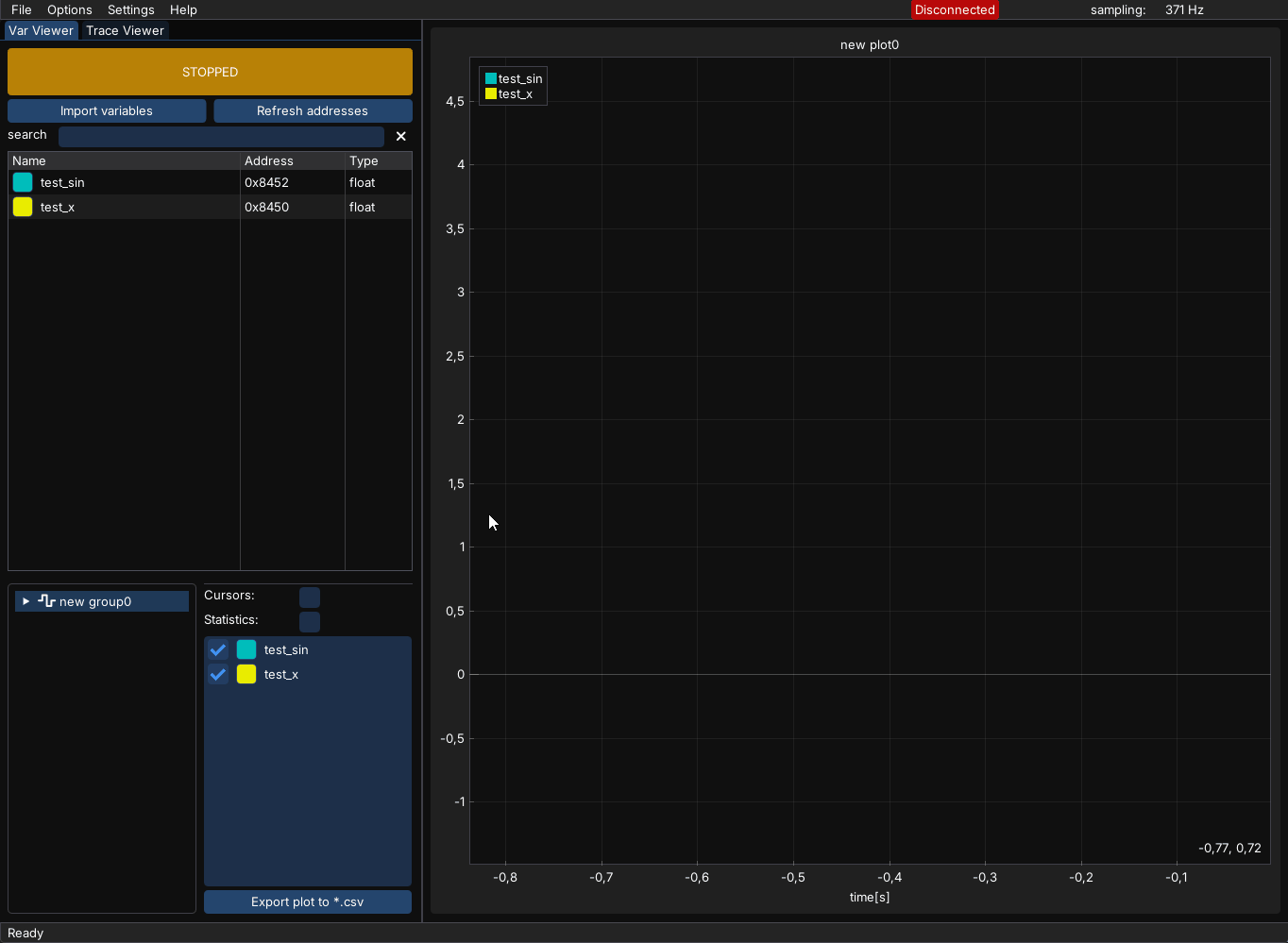 This means the serial driver is working and now it’s ready to visualize our data. Select ‘Import Variables’ and pick ‘test_x’ and ‘test_sin’ variables.