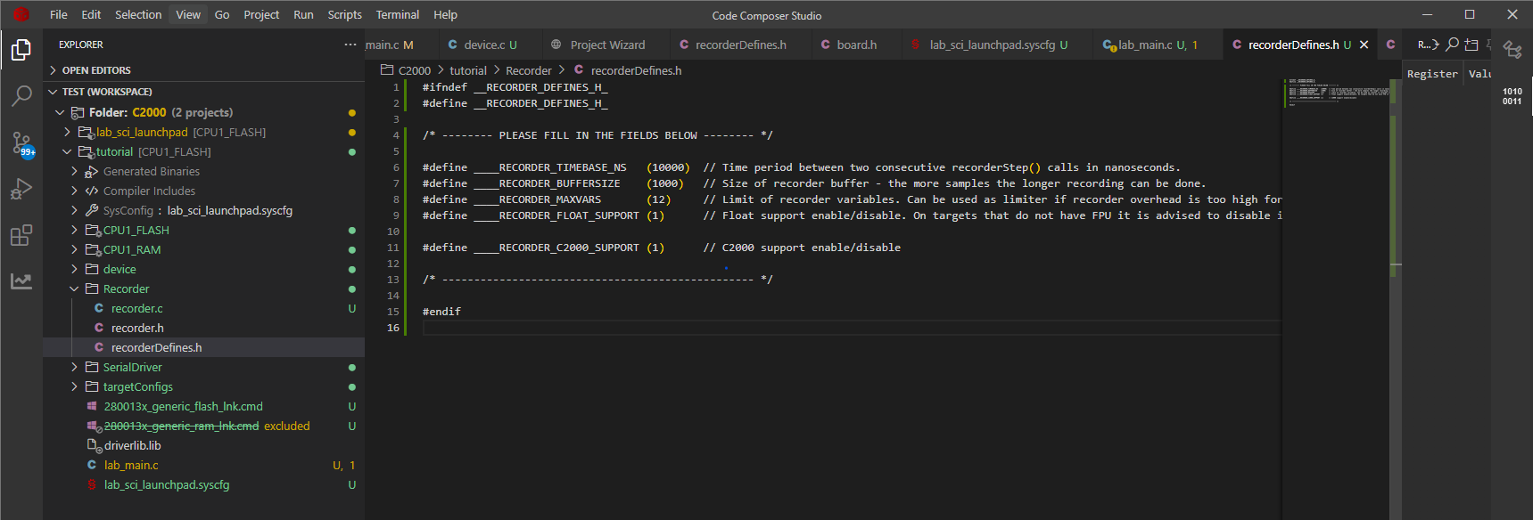 The recorder works by sampling selected variables at regular intervals - usually from within a high frequency interrupt - out 10kHz interrupt fits this requirements perfectly. Let’s add the #include "Recorder/recorder.h" include and recorderStep() call inside the interrupt like so: