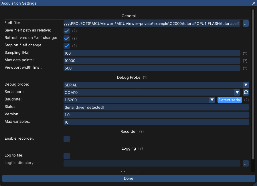 Let’s launch MCUViewer, select Options->Acquisition and select the *.elf file. Next, switch the debug probe to SERIAL, and fill in the port and baudrate values. Make sure the port is free (not used by other software such as UART terminal), and click Detect serial button. You should see the serial driver version and max variables in the status text box as in the picture below: