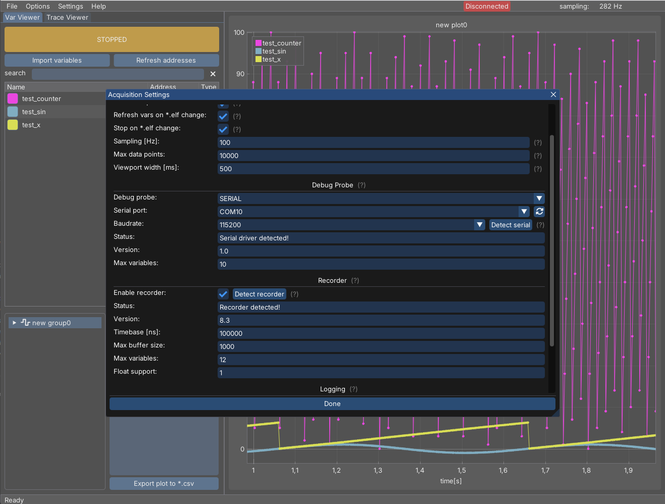 This means the serial driver is working and now it’s ready to visualize our data. Select ‘Import Variables’ and pick ‘test_x’ and ‘test_sin’ variables.