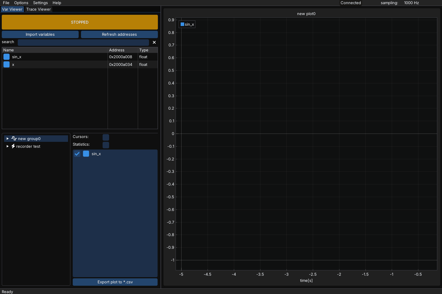 Sometimes Variable Viewer sampling rate is not stable enough, especially when high sampling rates are needed. In such cases, it is better to use the Recorder module. More on the recorder module can be found in the Recorder section. In out case we’re going to call the recorderStep() function in a 50kHz interrupt handler.
