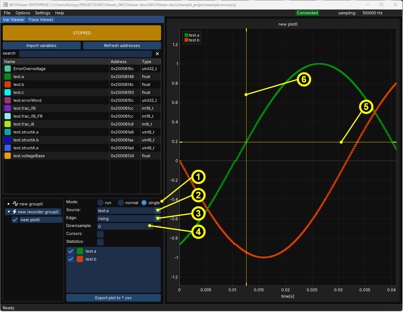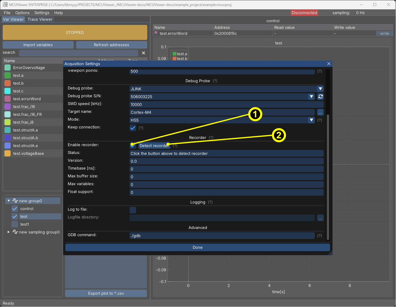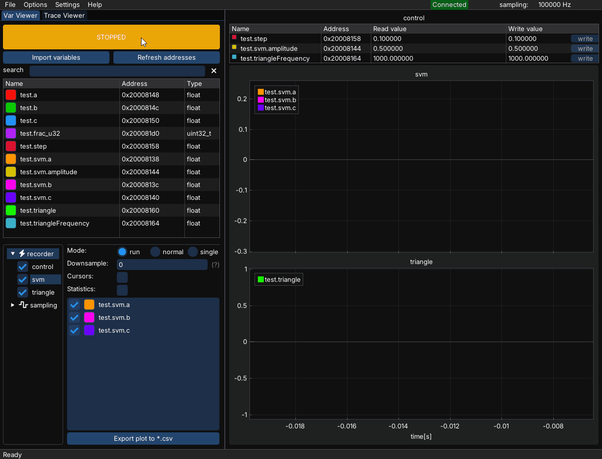 The recorder module allows visualization of very high-speed signals, even on low-cost targets or when SWD communication speed is limited due to galvanic isolators or long cables. It is more intrusive than using a sampling group, as it must be compiled into your project-although the runtime penalty is usually minimal.